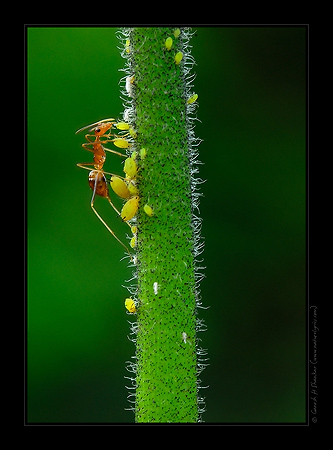 aphids give ants honey dews. You may be able to see a tiny drop of a dew emerging out of back of an aphids which the ant is ready to consume in the